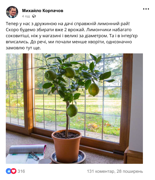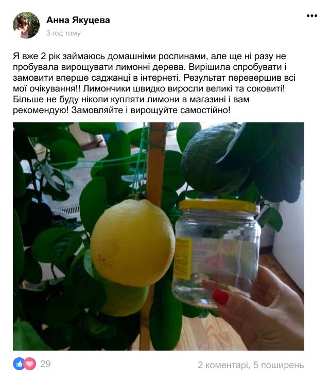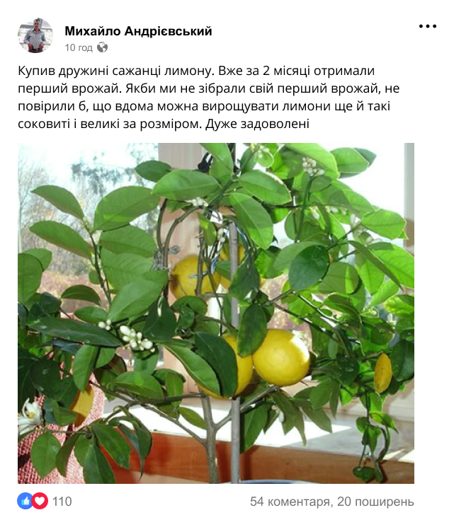 Наш постійний покупець, Микола Стецюк із Рівненщини, захопився вирощуванням рослин вдома після того, як 1 раз замовив у нас саджанці лимону. Тепер пан Микола, якому 67 років, знайшов справу життя і будує власний бізнес, пов'язаний із саджанцями рослин!