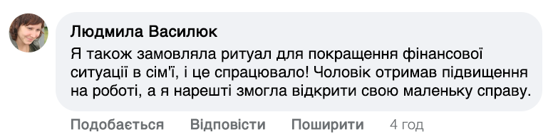 — Мої обряди – це поєднання молитви та особливих слів, які мають на меті направити енергію на добробут. Я проводжу іменні молитви, які читаю індивідуально для кожної людини. Щоб усе спрацювало, потрібна певна підготовка. Людина повинна опівночі запалити свічку і промовити: 'Хай все станеться як має статися, та буде – як буде. Ці слова пробуджують енергію достатку та удачі. Після цього людина відчуває, як в її житті починають відбуватися зміни – гроші знаходять шлях до її дому.