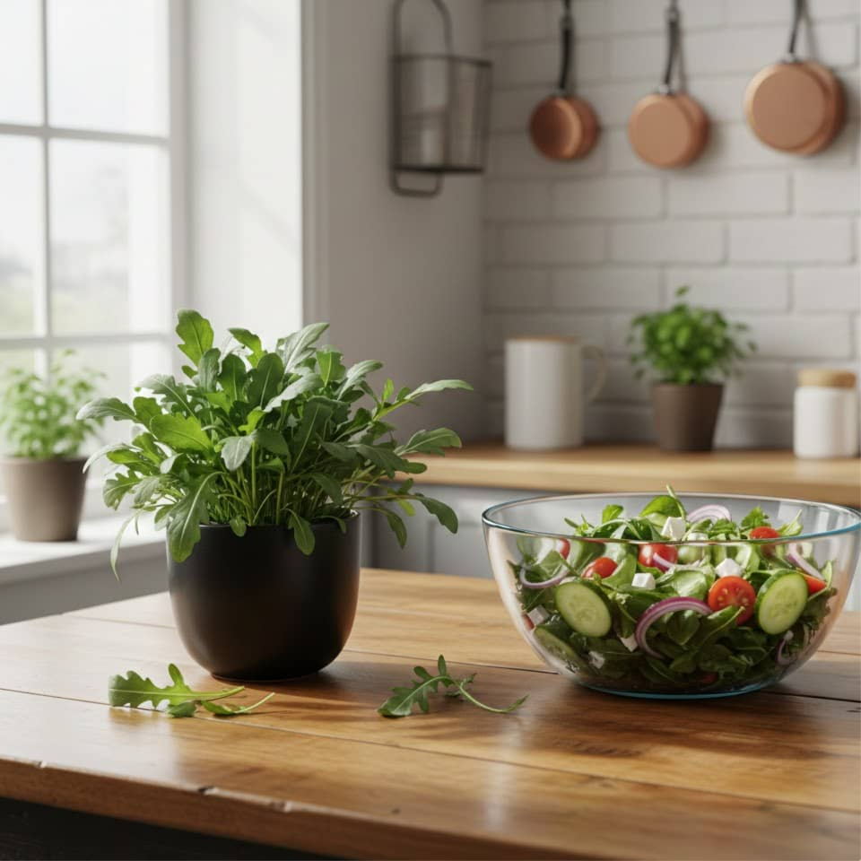 Рукола з домашнього горщика — соковита, хрустка та дуже ароматна. Має легкий горіховий післясмак, підходить до пасти, салатів, м’яса або як гарнір. Це одна з найшвидших зеленей: перший урожай можна зривати вже через 14–18 днів. І постійно відростає.