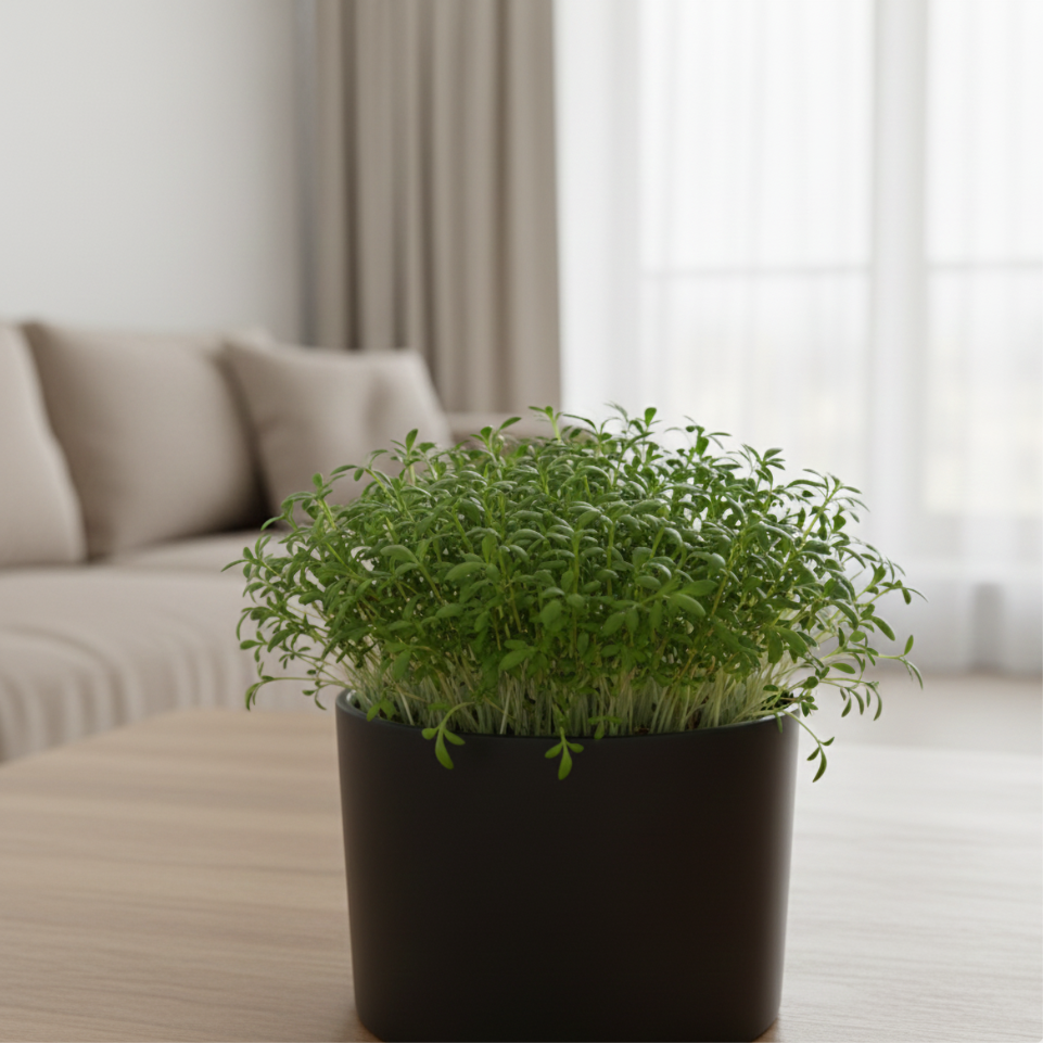 Ніжний, соковитий і з приємною гостринкою. Кімнатний крес-салат росте надзвичайно швидко, утворює густий килимчик зелені та миттєво відновлюється після зрізання. Ідеальний для салатів, сендвічів, омлетів, гарнірів і корисних перекусів. У квартирі формує дрібні, але дуже ароматні листочки, які зберігають свіжість краще, ніж магазинні. Ви зрізаєте частину — і нова хвиля зелені виростає буквально за кілька днів.